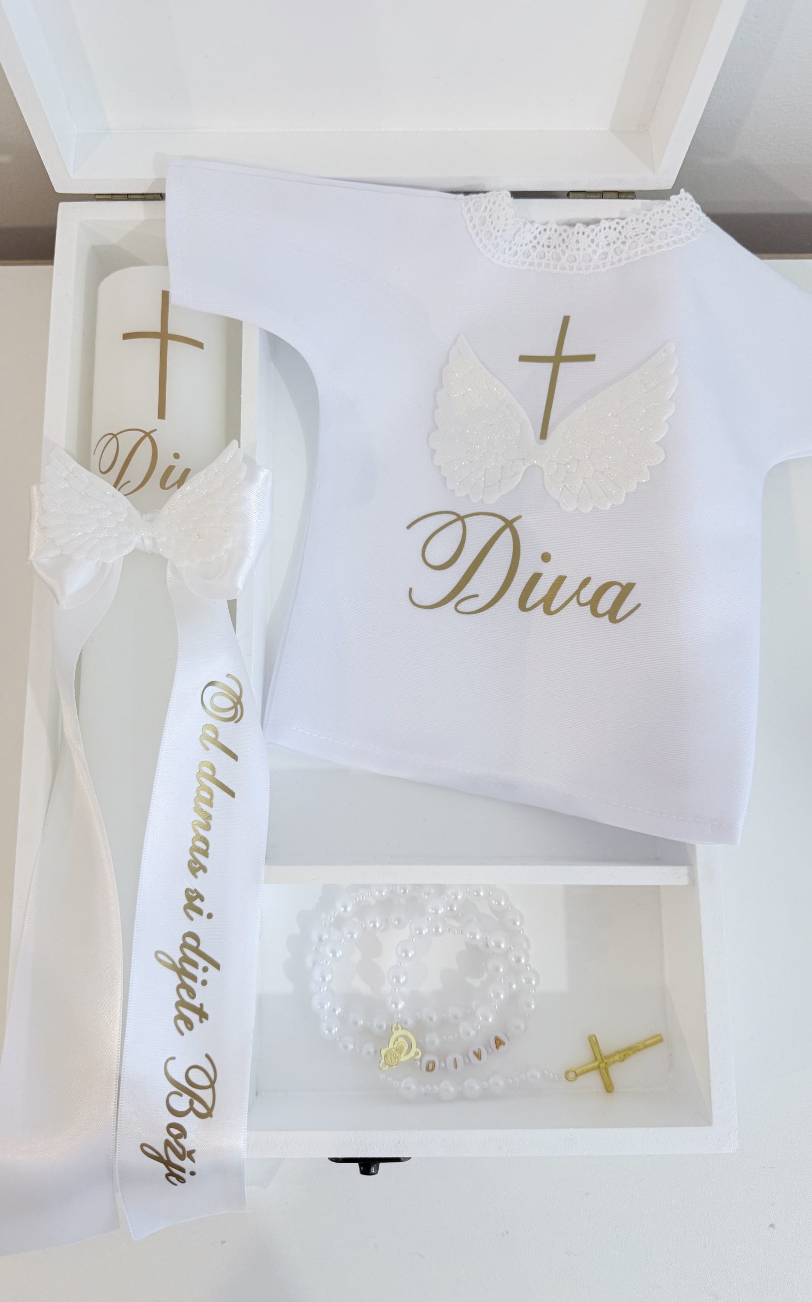 Krsni set sastoji se od svijeće, košuljice i krunice u mdf kutiji.