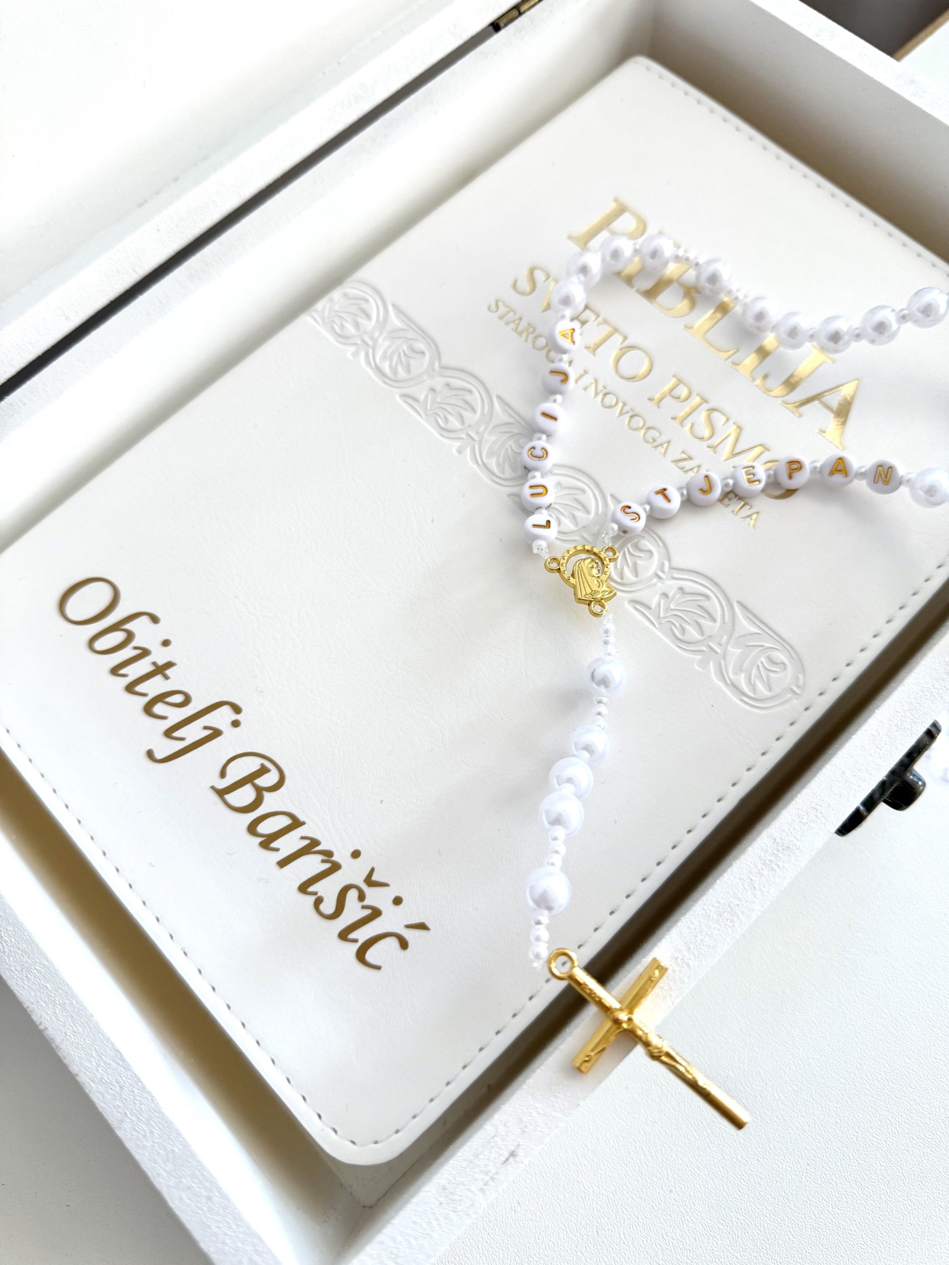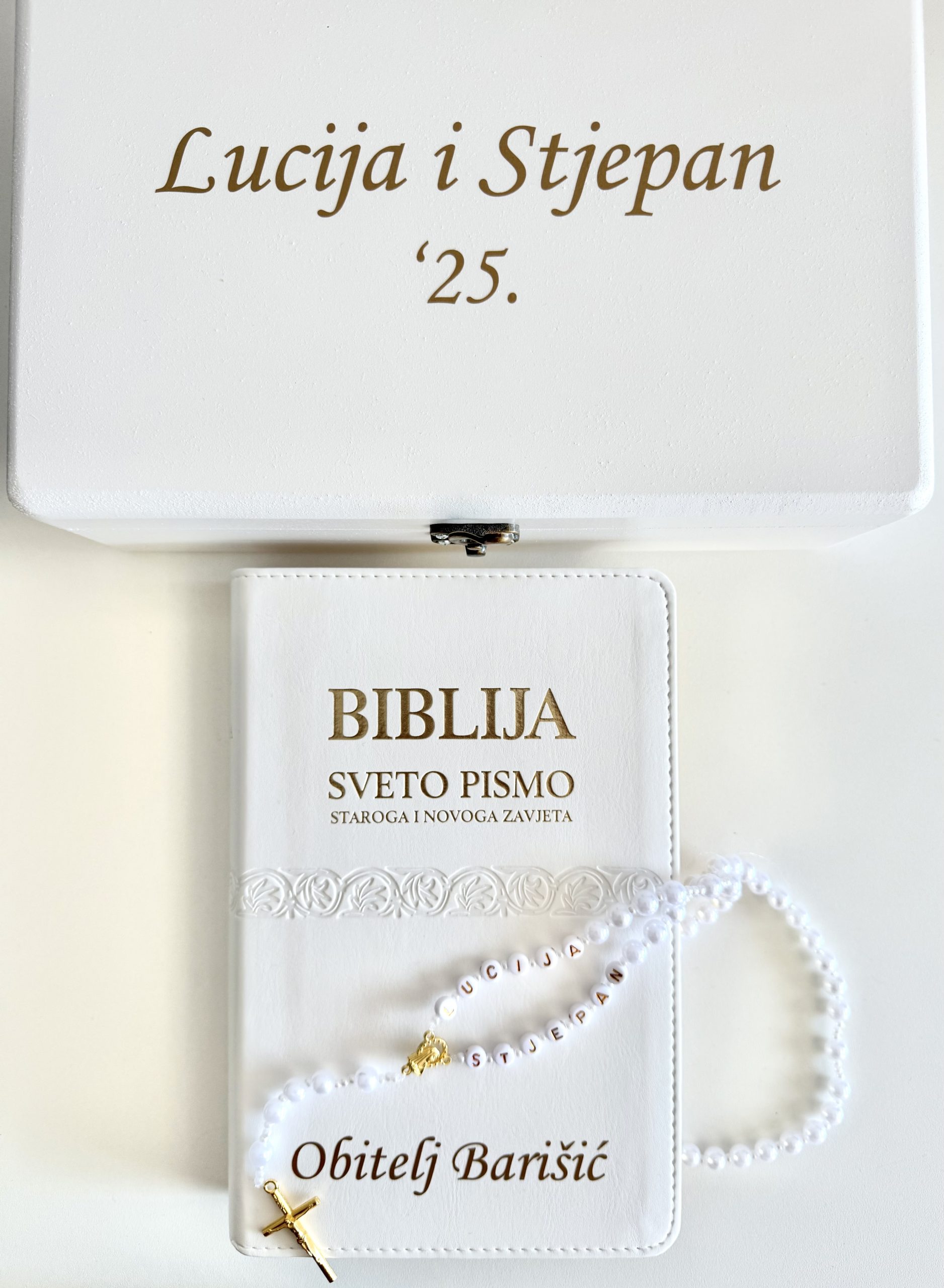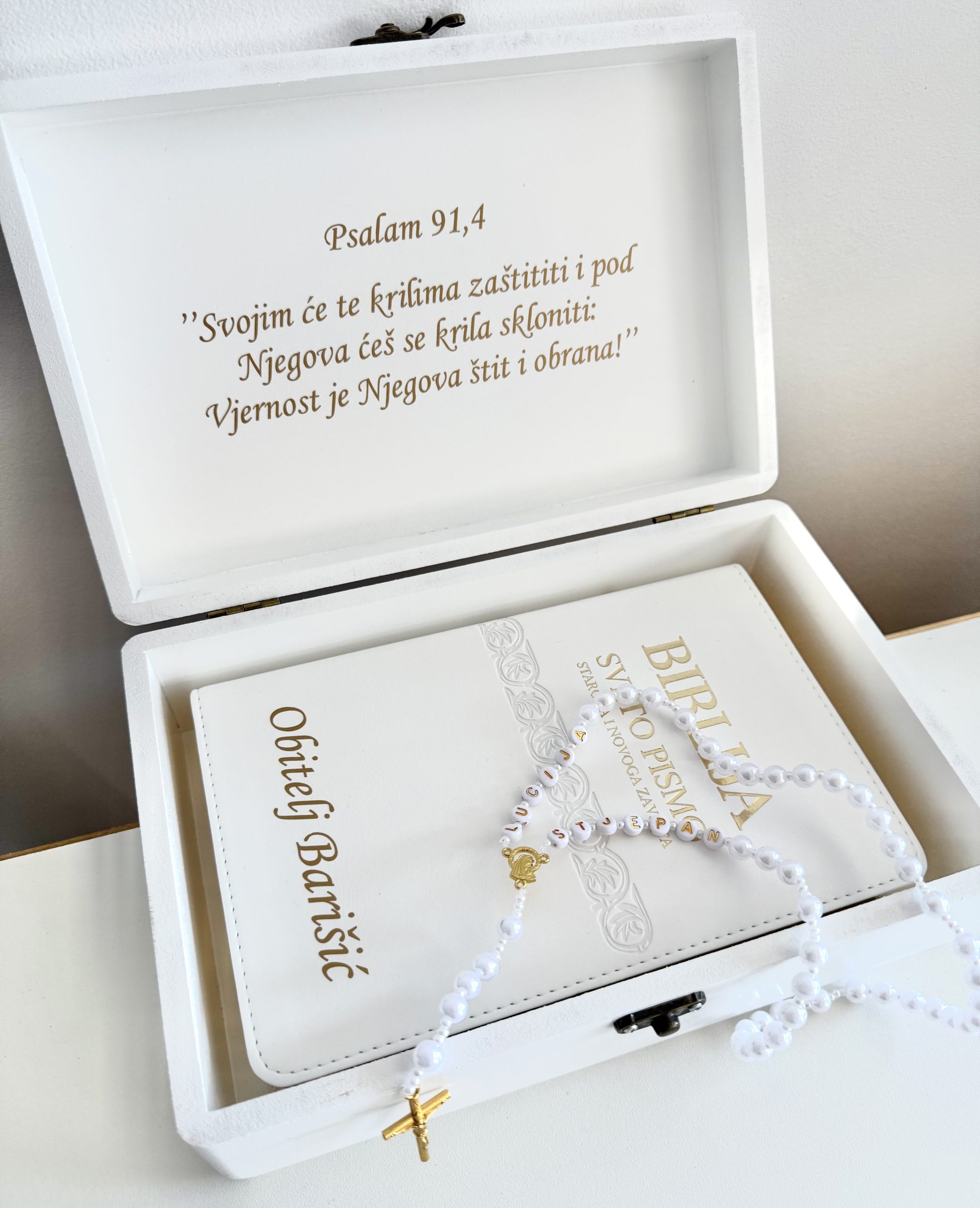 Personalizirana Biblija i krunica u drvenoj kutiji – poklon za vjenčanje