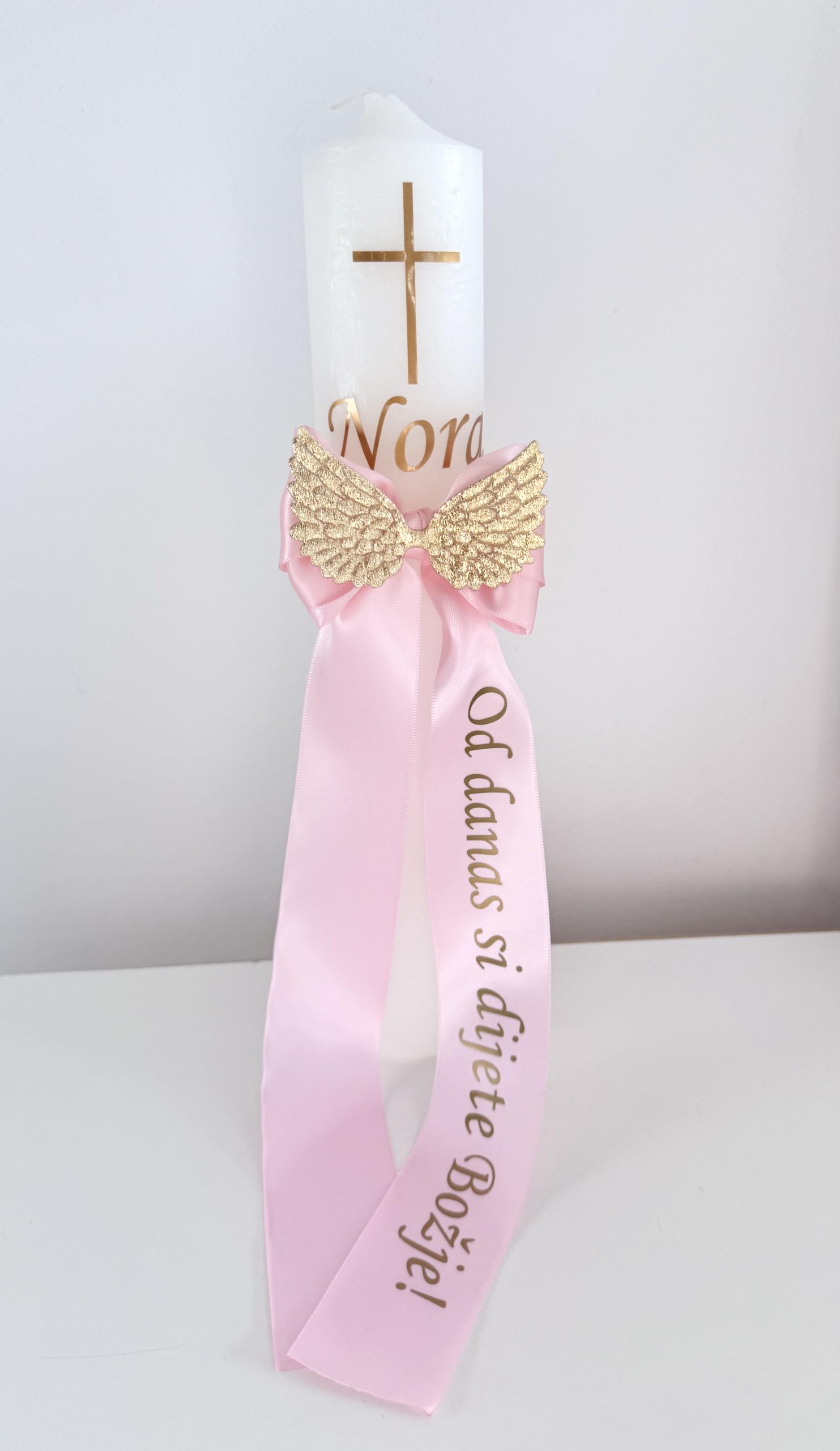 Personalizirana krsna svijeća sa svjetlo rozom mašnom
