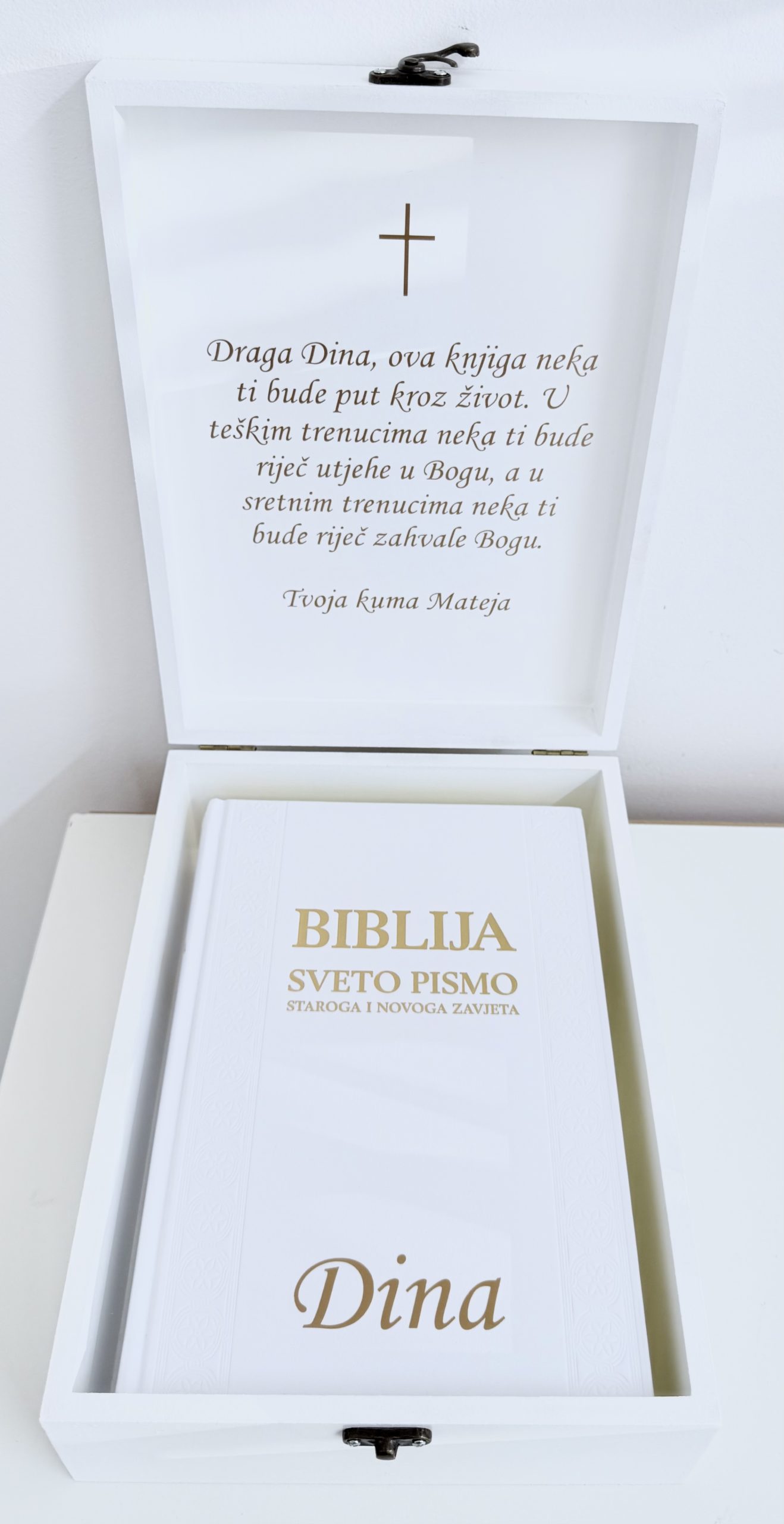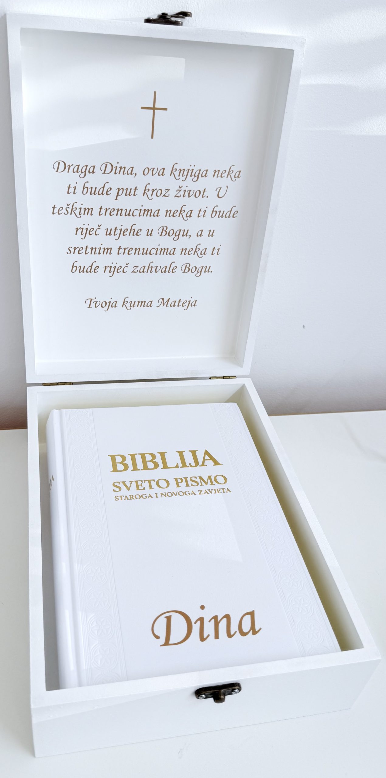 Personalizirani set sastoji se od Biblije (Sveto pismo Staroga i Novoga zavjeta) u drvenoj kutiji.