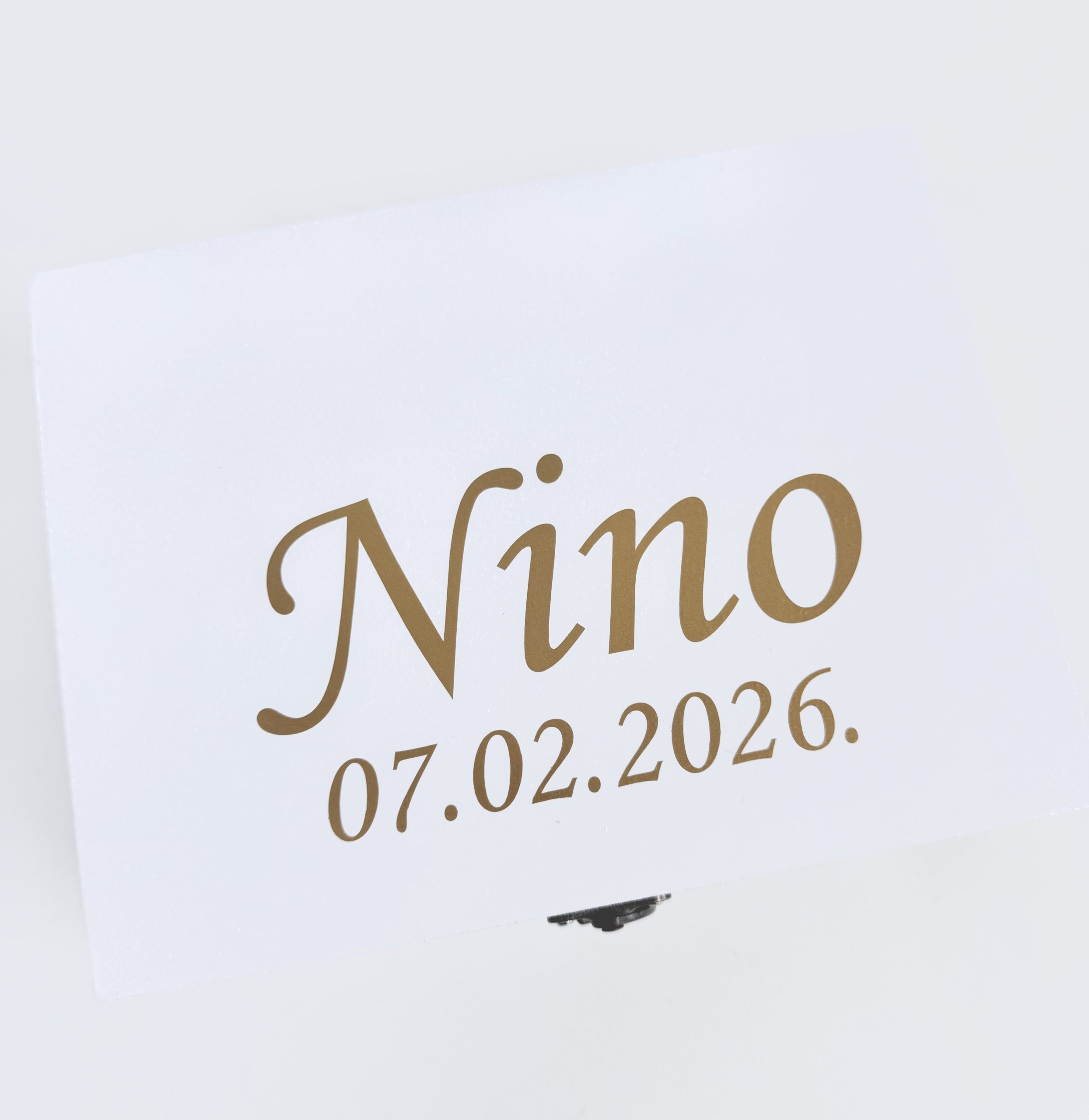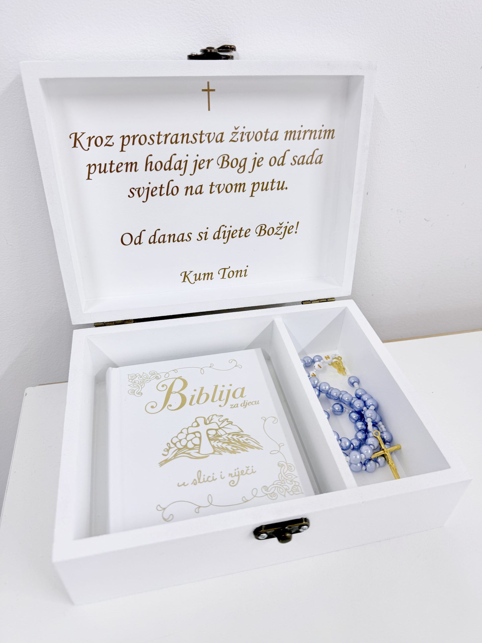 Poklon paket sastoji se od Dječje Biblije i krunice u personaliziranoj drvenoj kutiji.