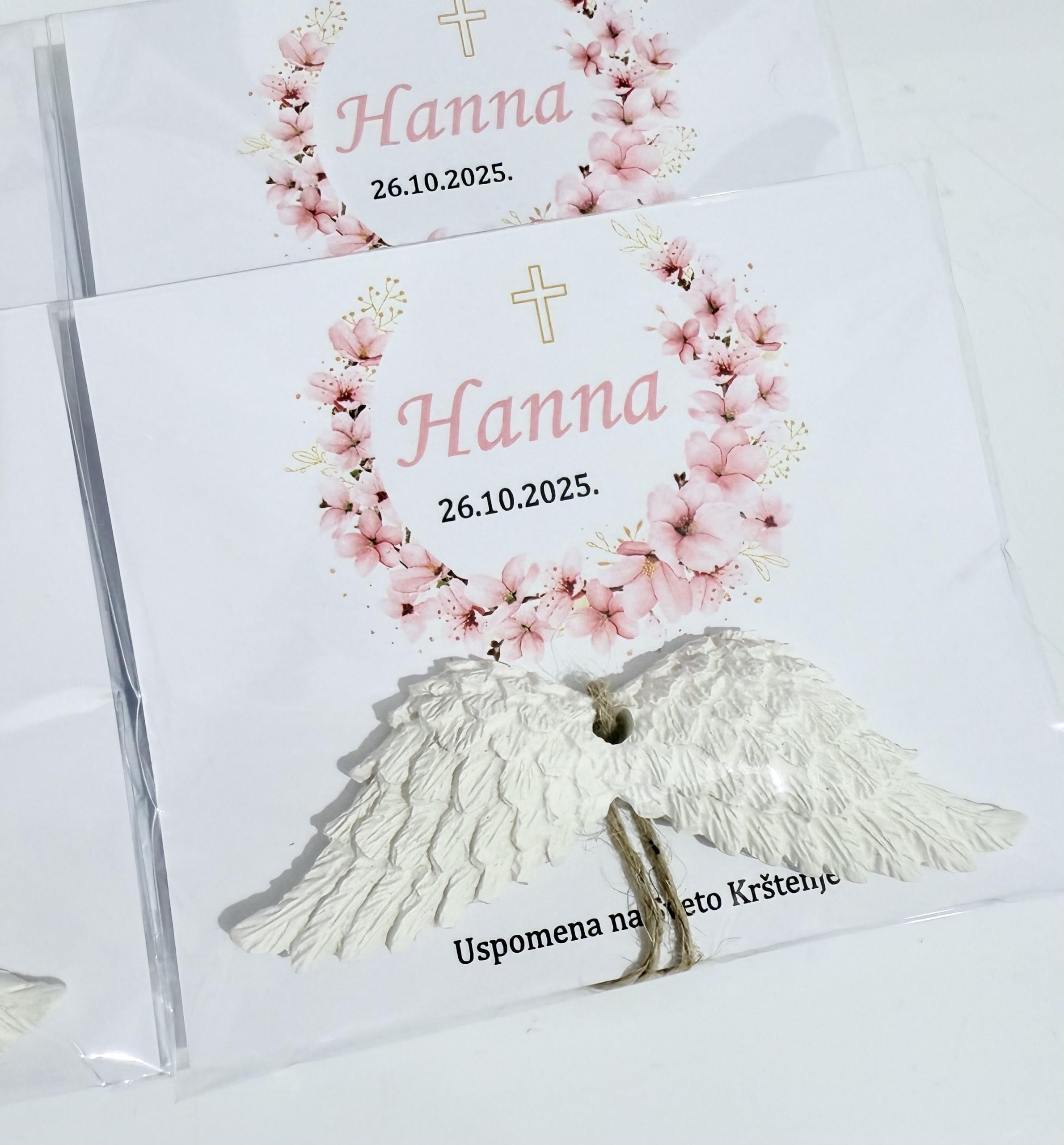 Predivna bijela krila od gipsa upakirana sa personaliziranim kartonom u prozirnu foliju. Dizajn slažemo po želji.